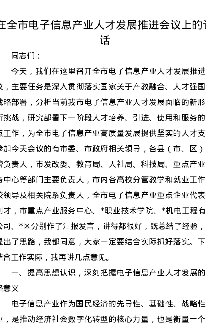 在全市电子信息产业人才发展推进会议上的讲话