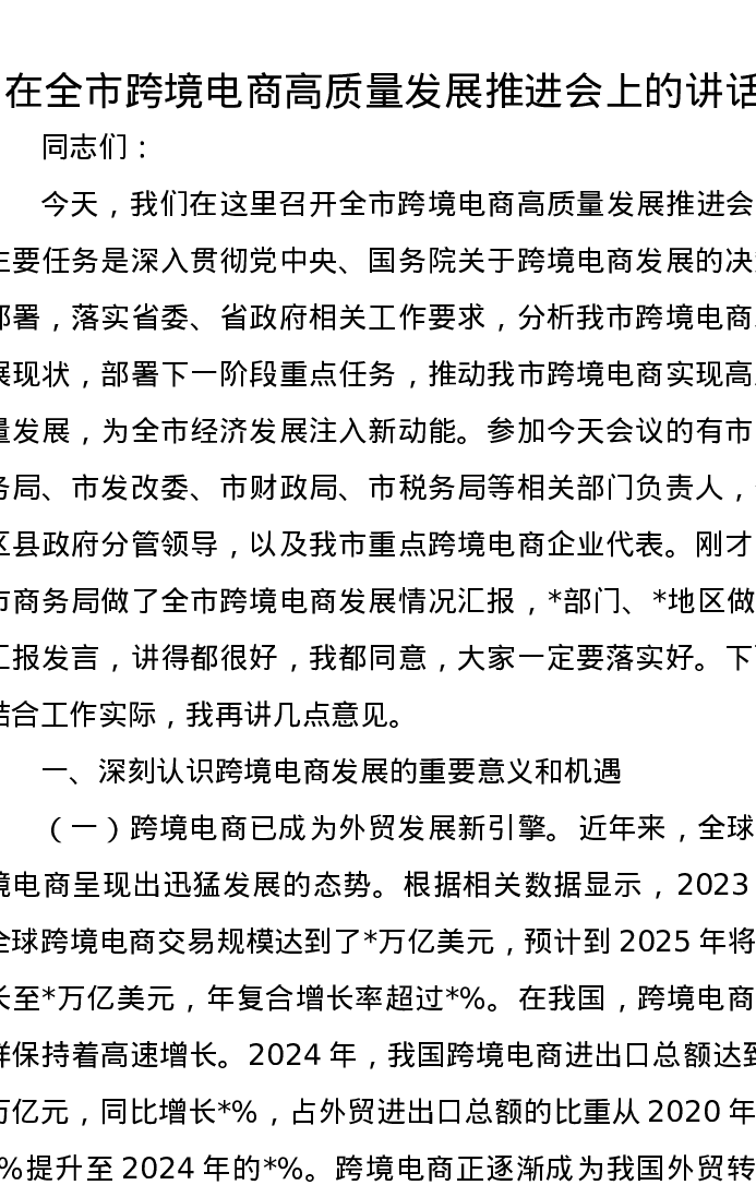 在全市跨境电商高质量发展推进会上的讲话