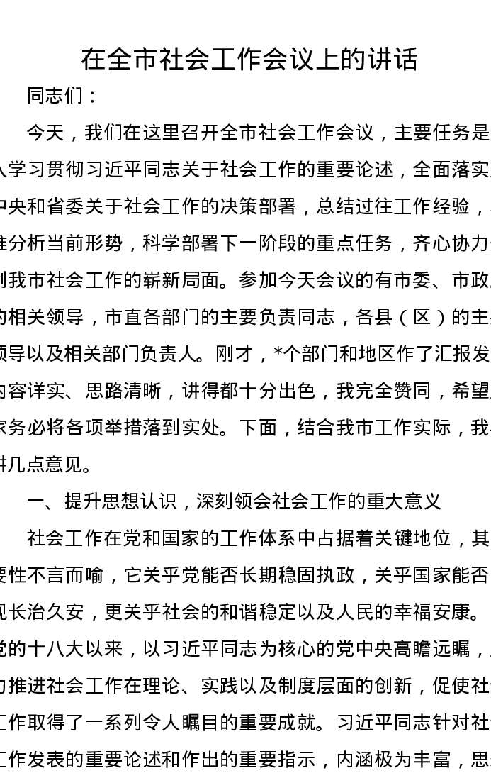 在全市社会工作会议上的讲话