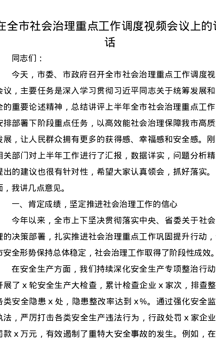 在全市社会治理重点工作调度视频会议上的讲话(2)