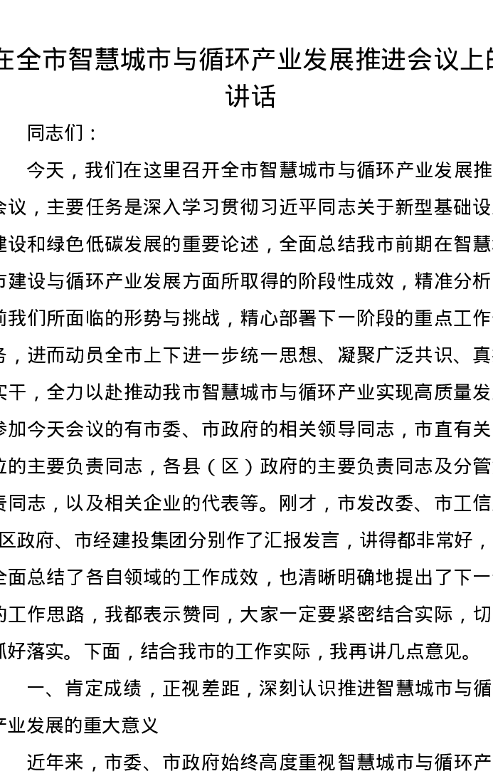 在全市智慧城市与循环产业发展推进会议上的讲话