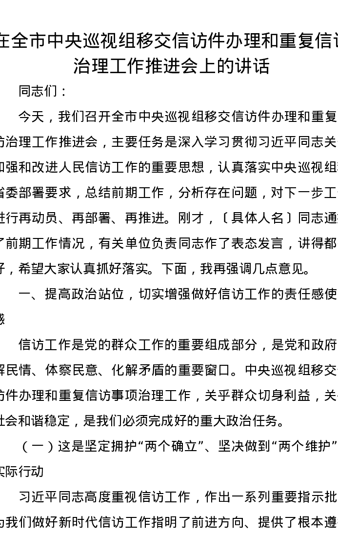 在全市中央巡视组移交信访件办理和重复信访治理工作推进会上的讲话