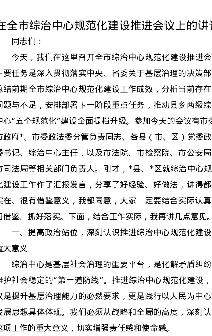 在全市综治中心规范化建设推进会议上的讲话