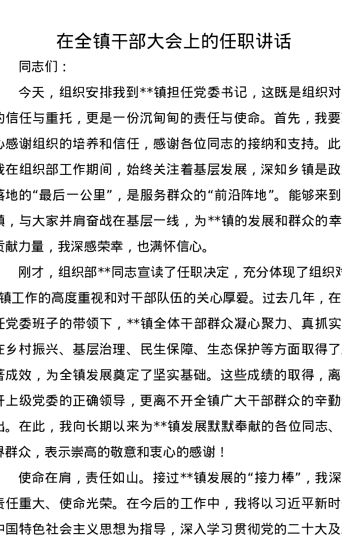 在全镇干部大会上的任职讲话