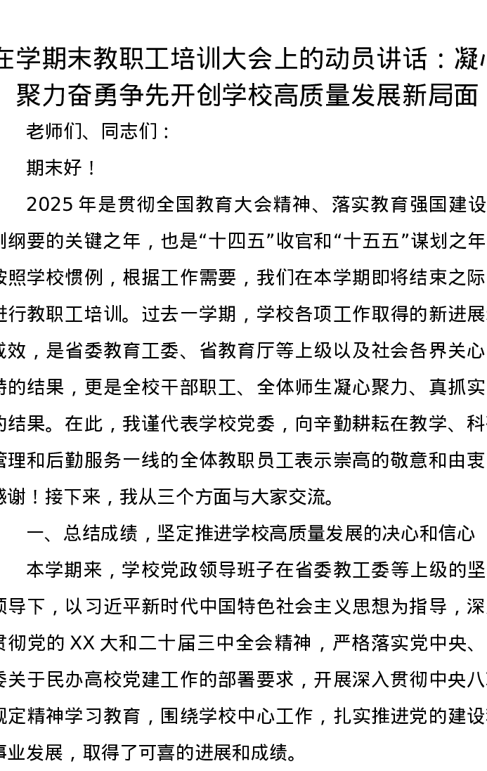在学期末教职工培训大会上的动员讲话:凝心聚力奋勇争先开创学校高质量发展新局面