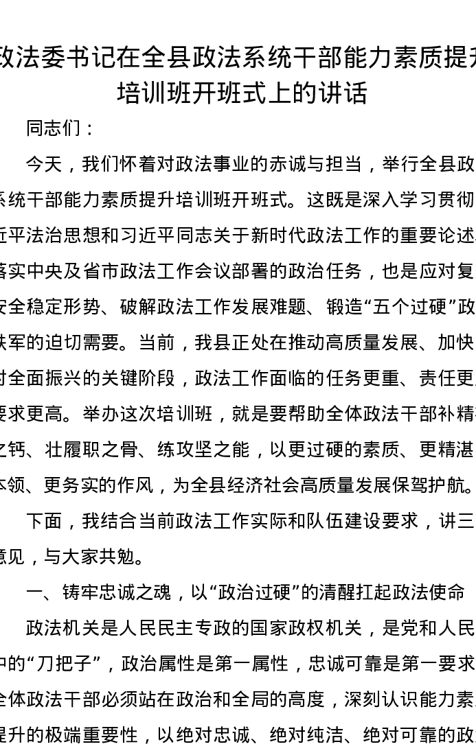 政法委书记在全县政法系统干部能力素质提升培训班开班式上的讲话