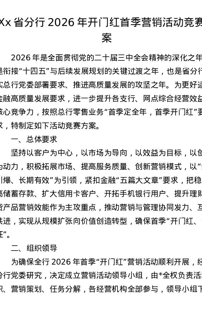 Xx省分行2026年开门红首季营销活动竞赛方案