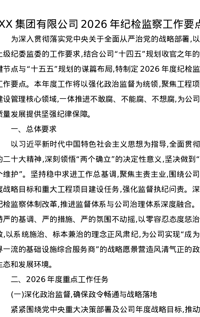 XX集团有限公司2026年纪检监察工作要点