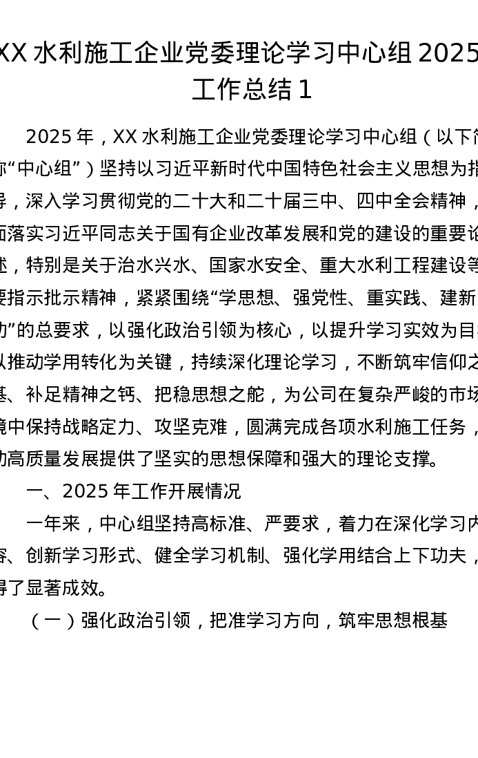 XX水利施工企业党委理论学习中心组2025年工作总结1