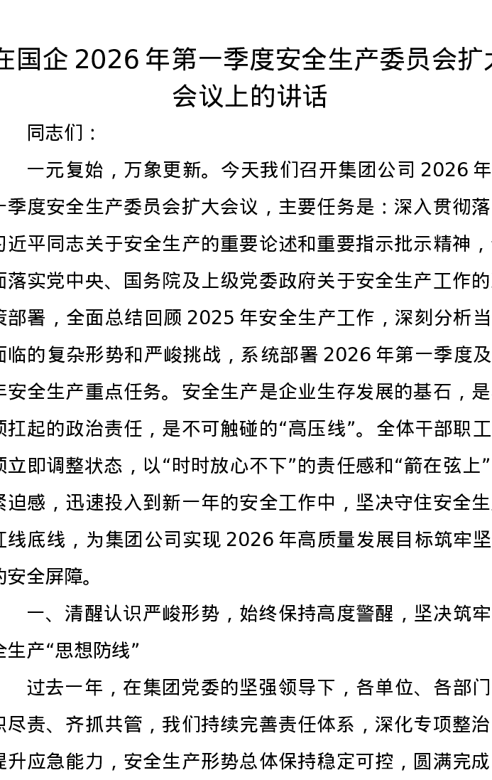 在国企2026年第一季度安全生产委员会扩大会议上的讲话