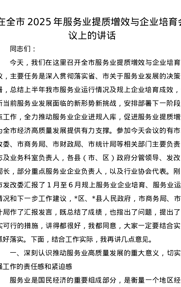 在全市2025年服务业提质增效与企业培育会议上的讲话