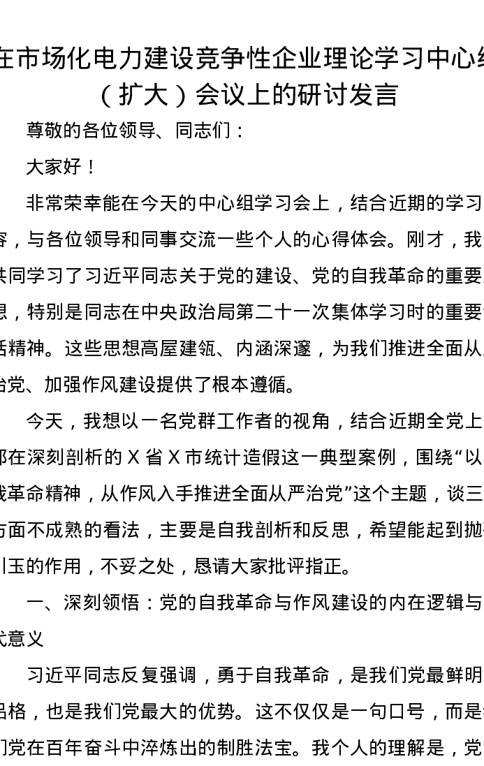 在市场化电力建设竞争性企业理论学习中心组(扩大)会议上的研讨发言