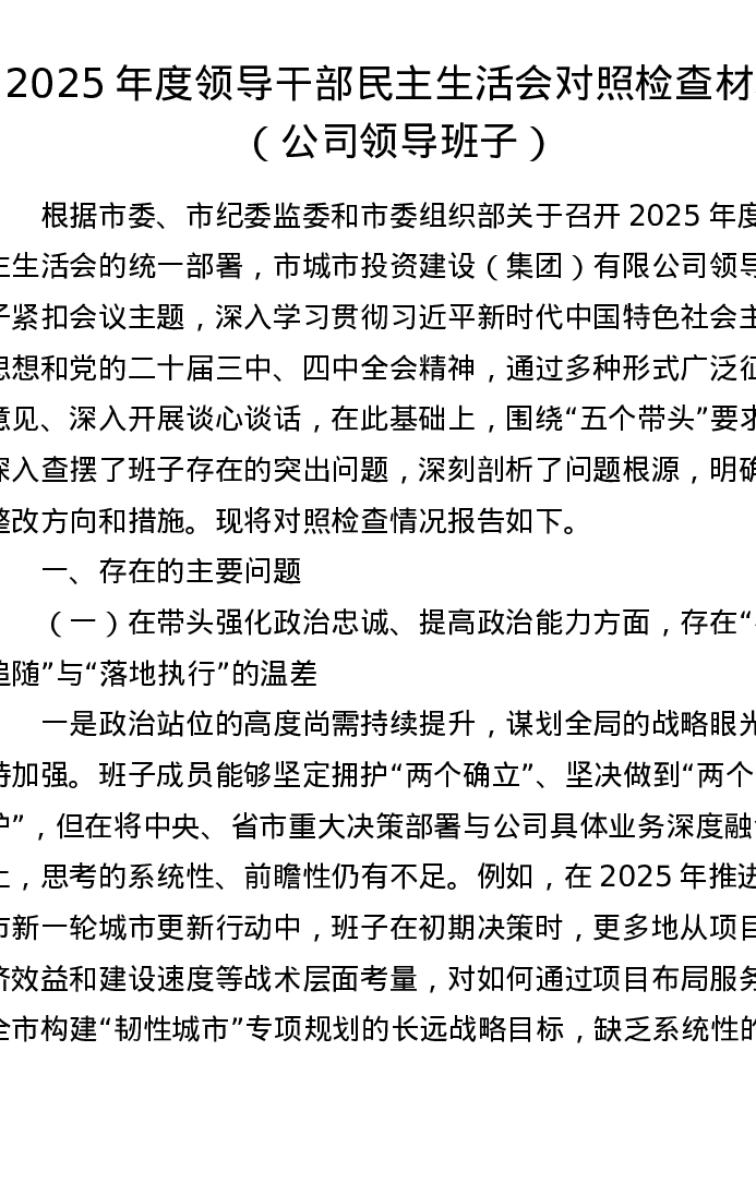 2025年度领导干部xxxxx对照检查材料(公司领导班子)(五个带头)