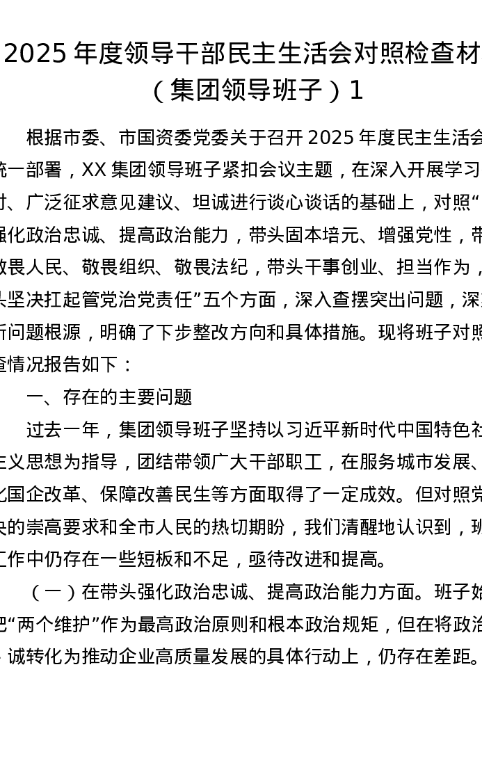 2025年度领导干部xxxxx对照检查材料(集团领导班子)1(五个带头)