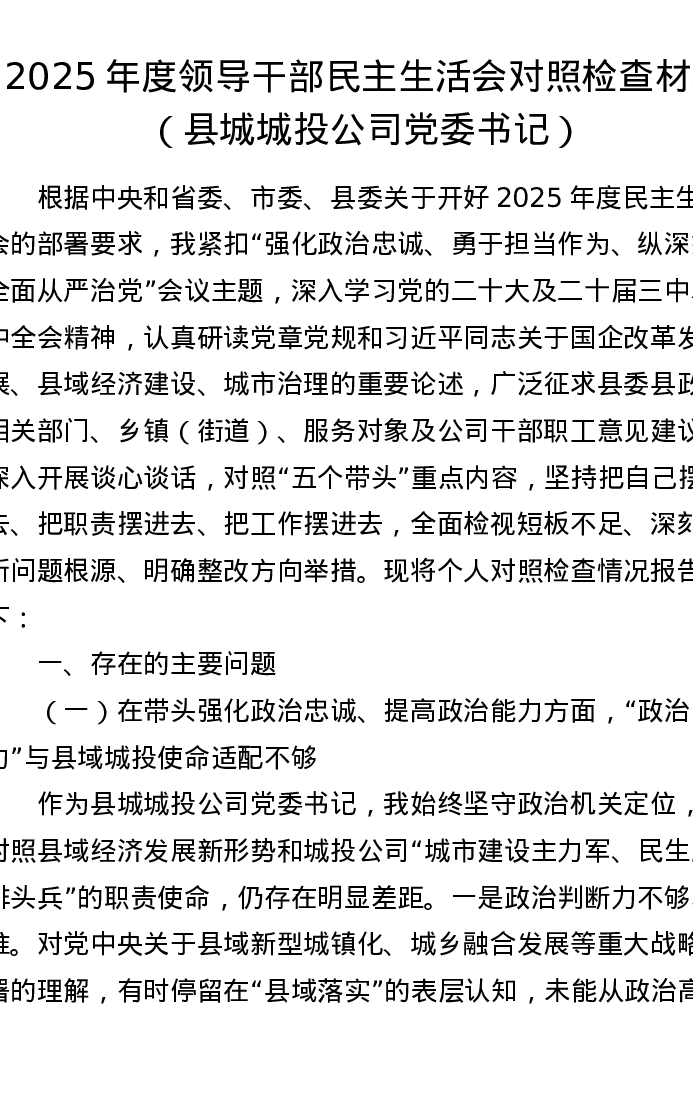 2025年度领导干部xxxxx对照检查材料(县城城投公司党委书记)(五个带头)
