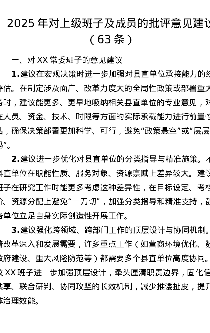 2025年对上级班子及成员的批评意见建议(63条)(五个带头)