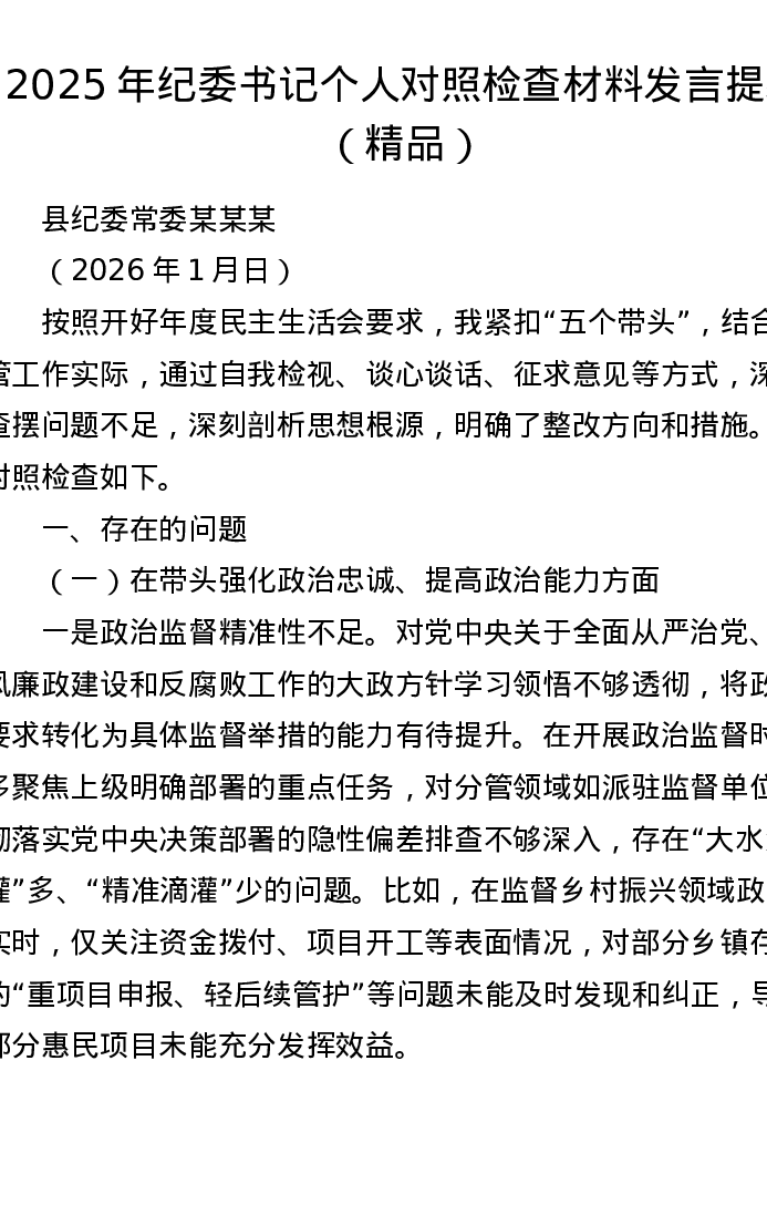 2025年纪委书记xxxxx个人对照检查材料发言提纲(五个带头)