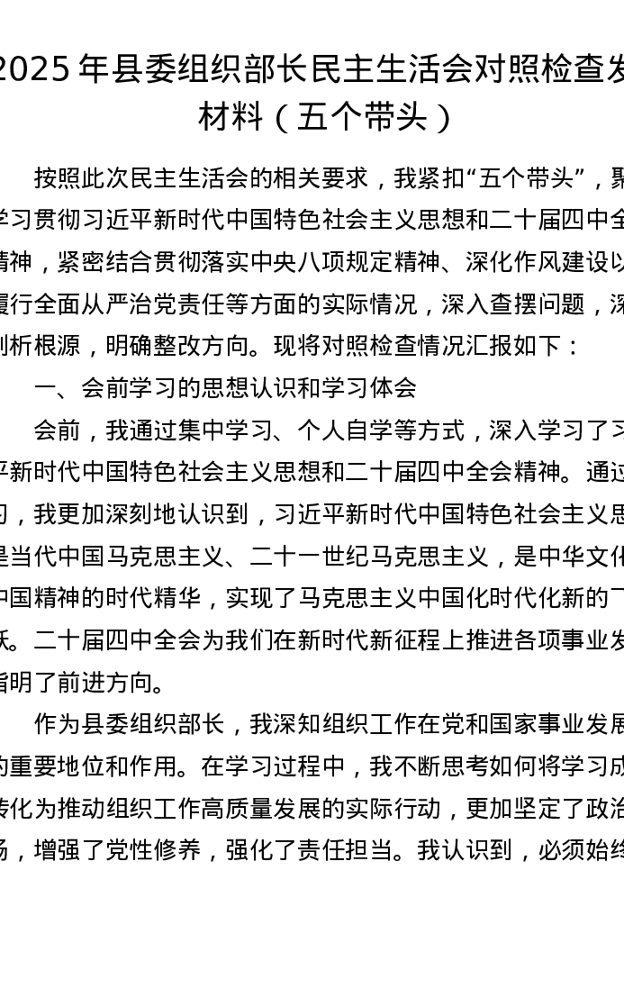 2025年县委组织部长xxxxx对照检查发言材料(五个带头)