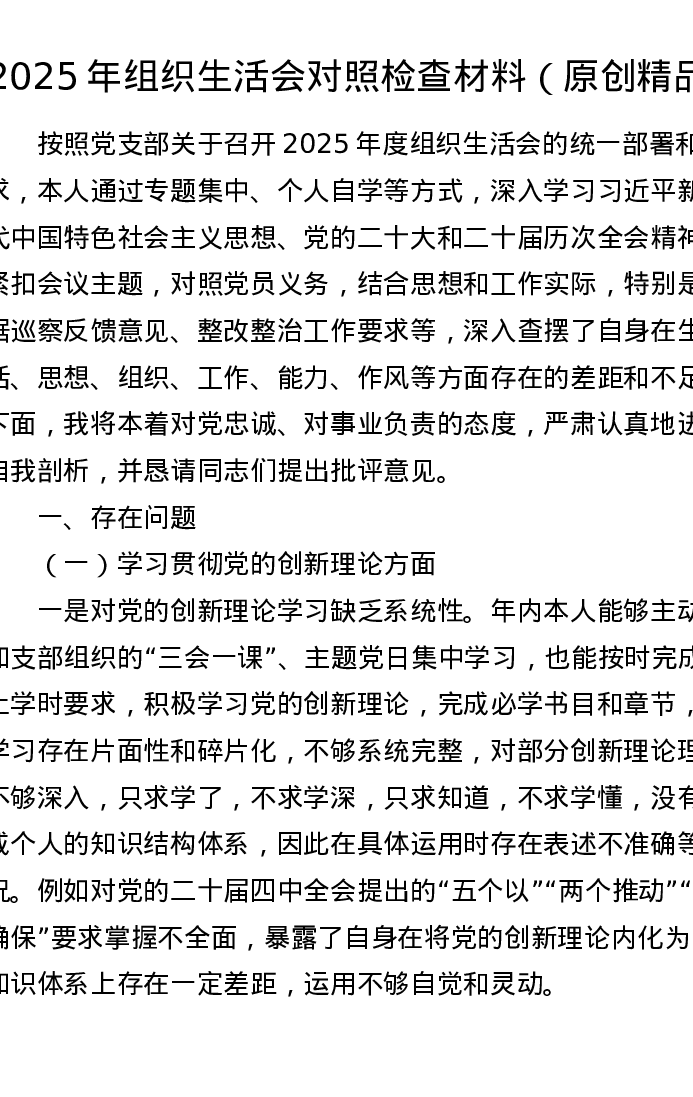 2025年组织xxx对照检查材料(原创精品)