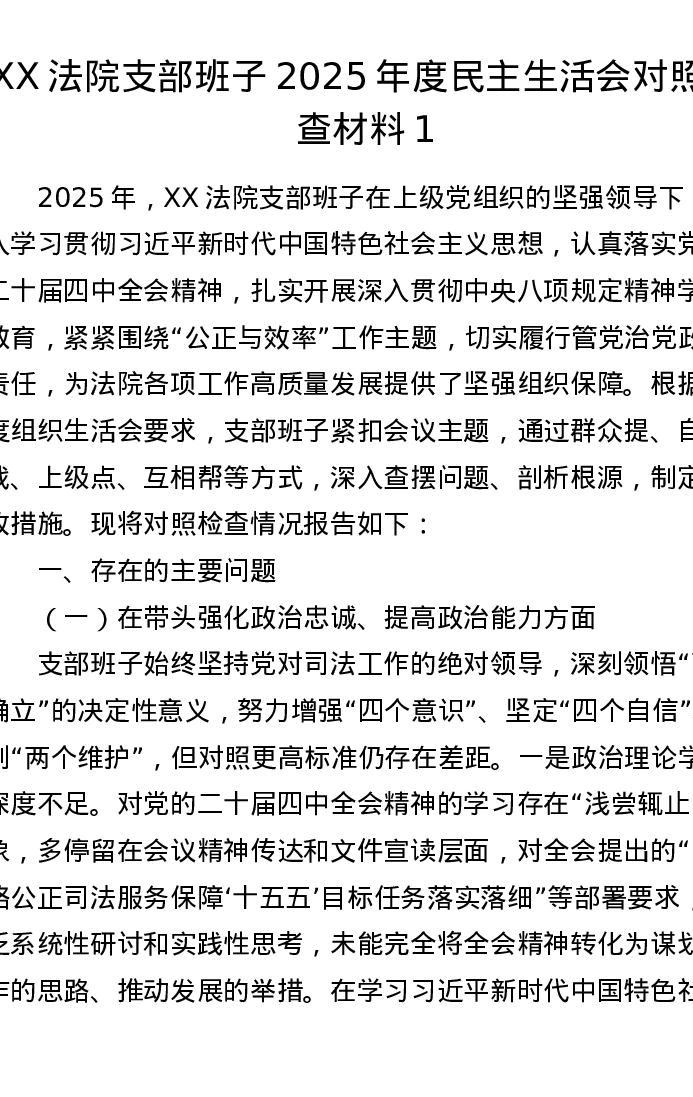 XX法院支部班子2025年度xxxxx对照检查材料1(五个带头)