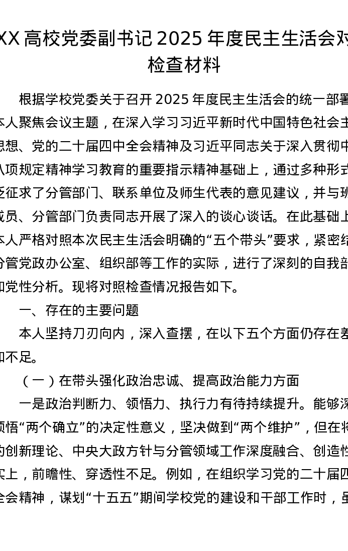 XX高校党委副书记2025年度xxxxx对照检查材料(五个带头)