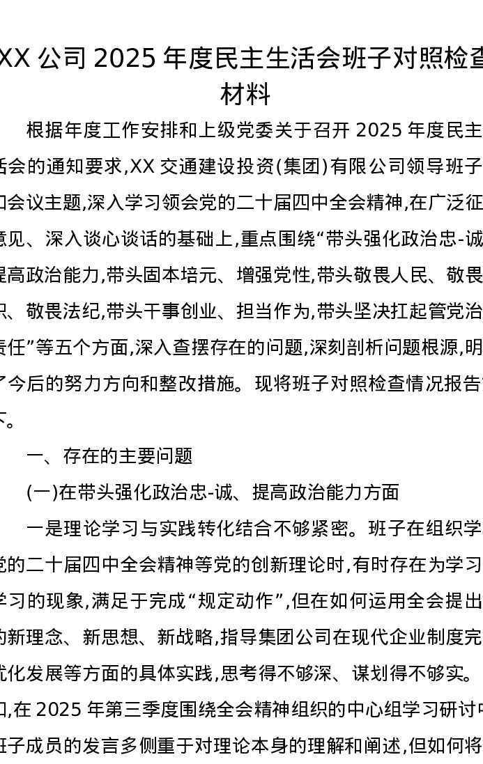 XX公司2025年度xxxxx班子对照检查材料(五个带头)