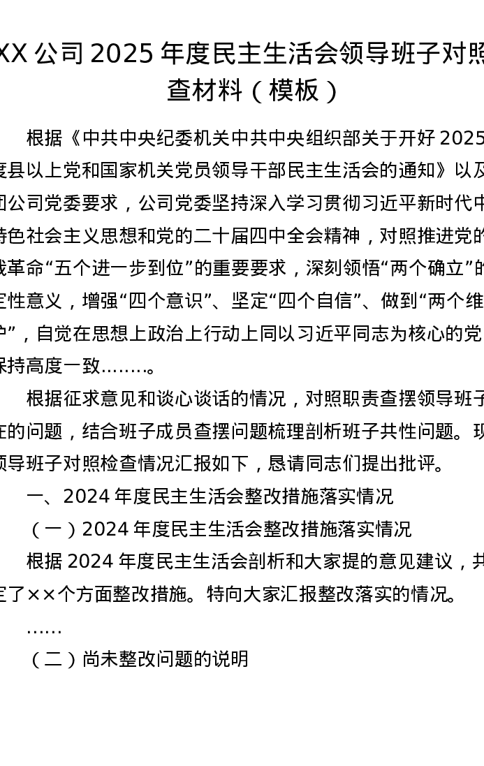 XX公司2025年度xxxxx领导班子对照检查材料(模板)