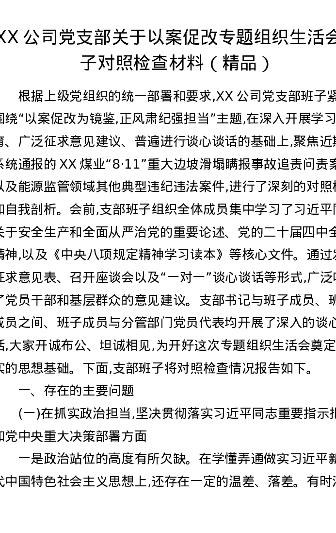 XX公司党支部关于以案促改专题组织xxx班子对照检查材料