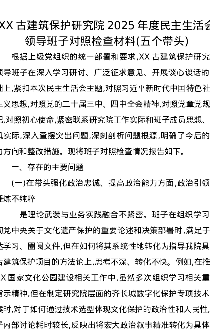 XX古建筑保护研究院2025年度xxxxx领导班子对照检查材料(五个带头)