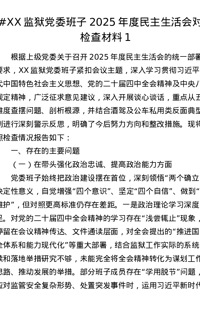 XX监狱党委班子2025年度xxxxx对照检查材料1(五个带头)
