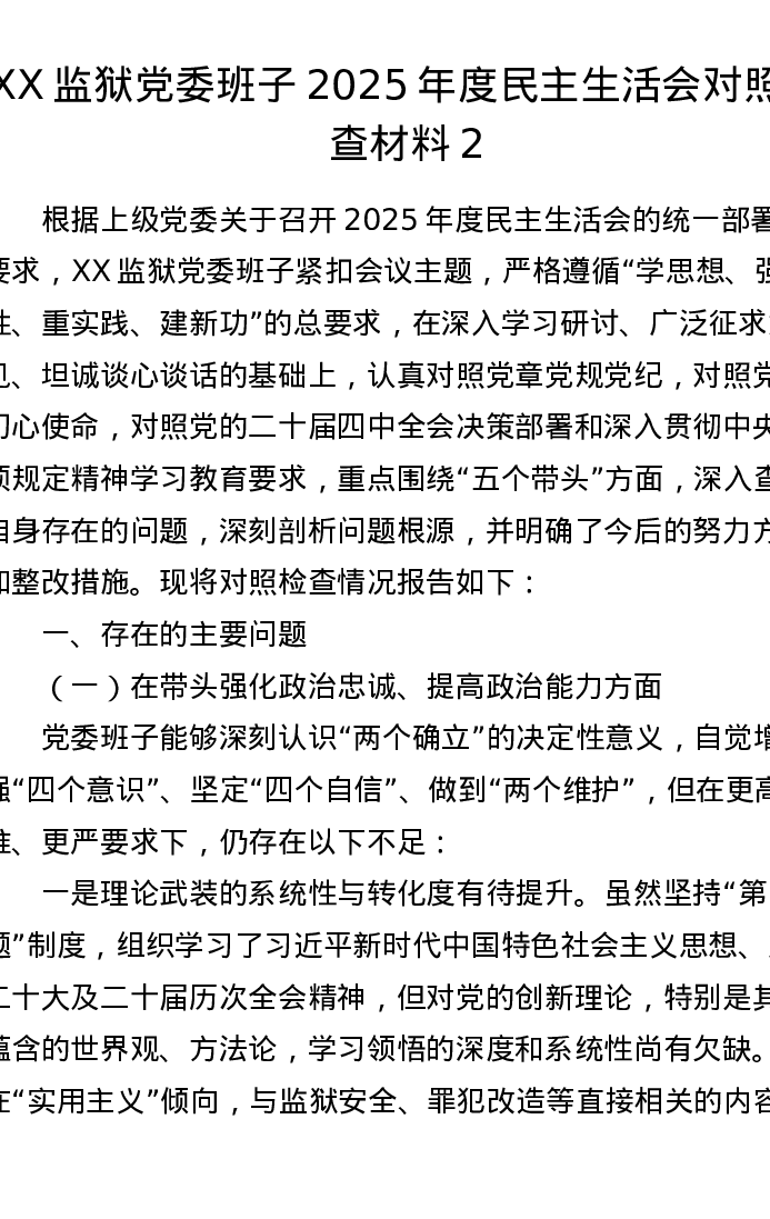 XX监狱党委班子2025年度xxxxx对照检查材料2(五个带头)