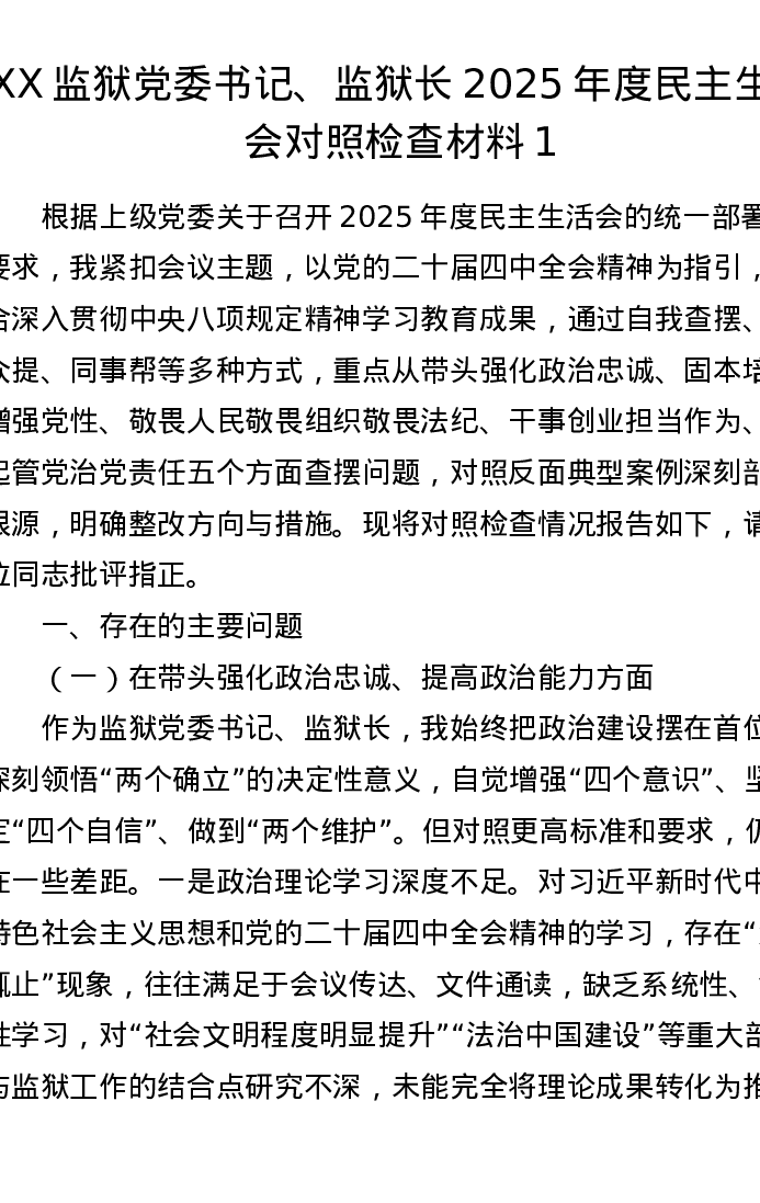 XX监狱党委书记、监狱长2025年度xxxxx对照检查材料(五个带头)