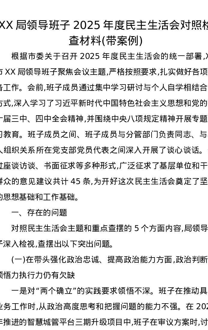 XX局领导班子2025年度xxxxx对照检查材料(带案例)(五个带头)