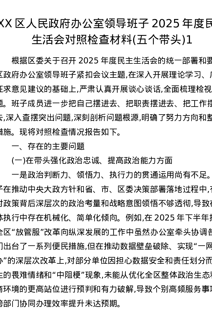 XX区人民政府办公室领导班子2025年度xxxxx对照检查材料(五个带头)1