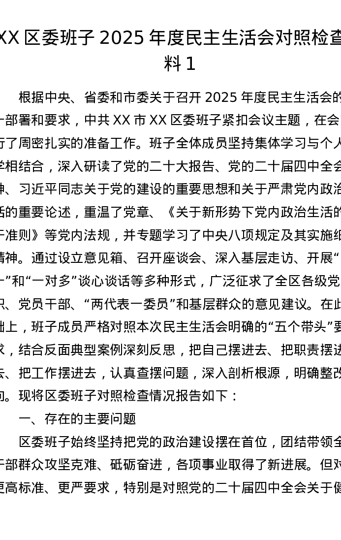 XX区委班子2025年度xxxxx对照检查材料1(五个带头)