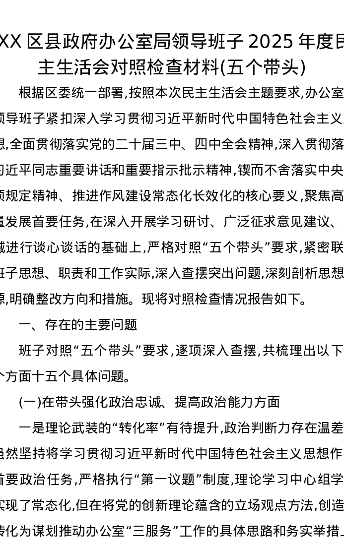 XX区县政府办公室局领导班子2025年度xxxxx对照检查材料(五个带头)