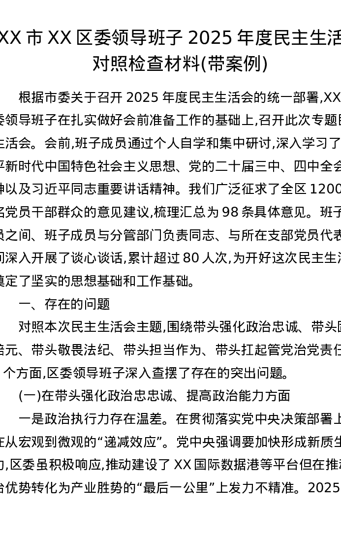 XX市XX区委领导班子2025年度xxxxx对照检查材料(带案例)(五个带头)