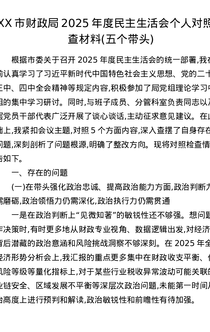 XX市财政局2025年度xxxxx个人对照检查材料(五个带头)