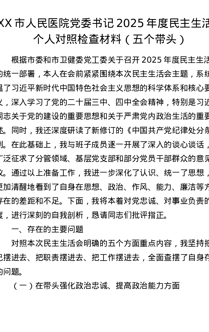XX市人民医院党委书记2025年度xxxxx个人对照检查材料(五个带头)