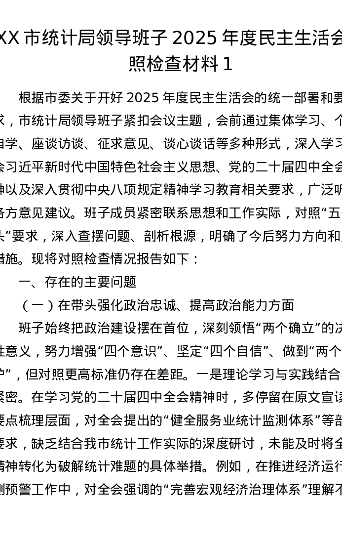 XX市统计局领导班子2025年度xxxxx对照检查材料1(五个带头)