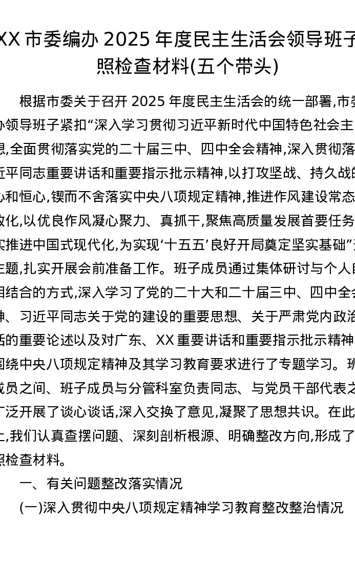 XX市委编办2025年度xxxxx领导班子对照检查材料(五个带头)