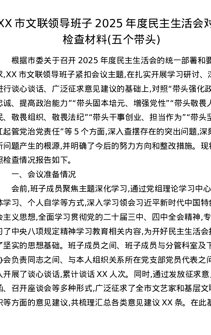 XX市文联领导班子2025年度xxxxx对照检查材料(五个带头)