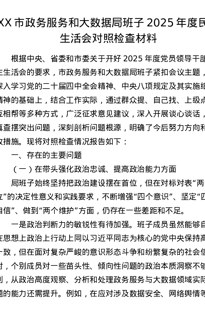 XX市政务服务和大数据局班子2025年度xxxxx对照检查材料(五个带头)