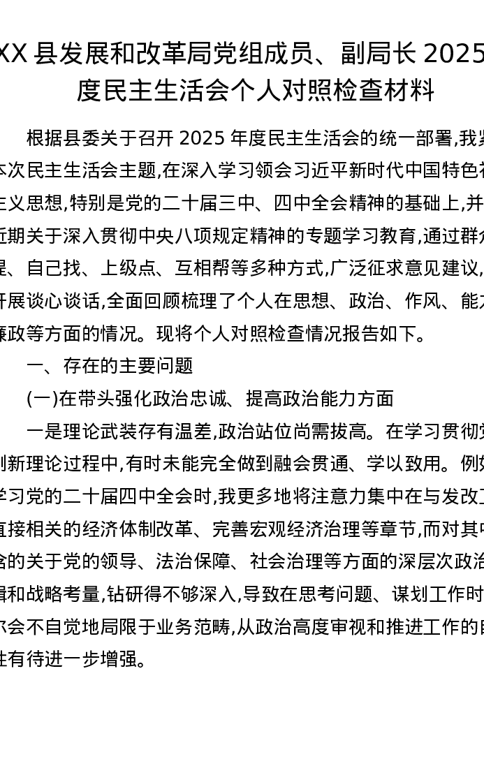 XX县发展和改革局党组成员、副局长2025年度xxxxx个人对照检查材料
