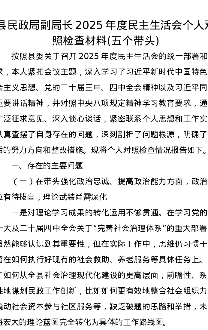 XX县民政局副局长2025年度xxxxx个人对照检查材料(五个带头)