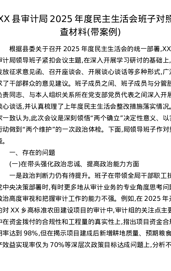 XX县审计局2025年度xxxxx班子对照检查材料(带案例(五个带头))