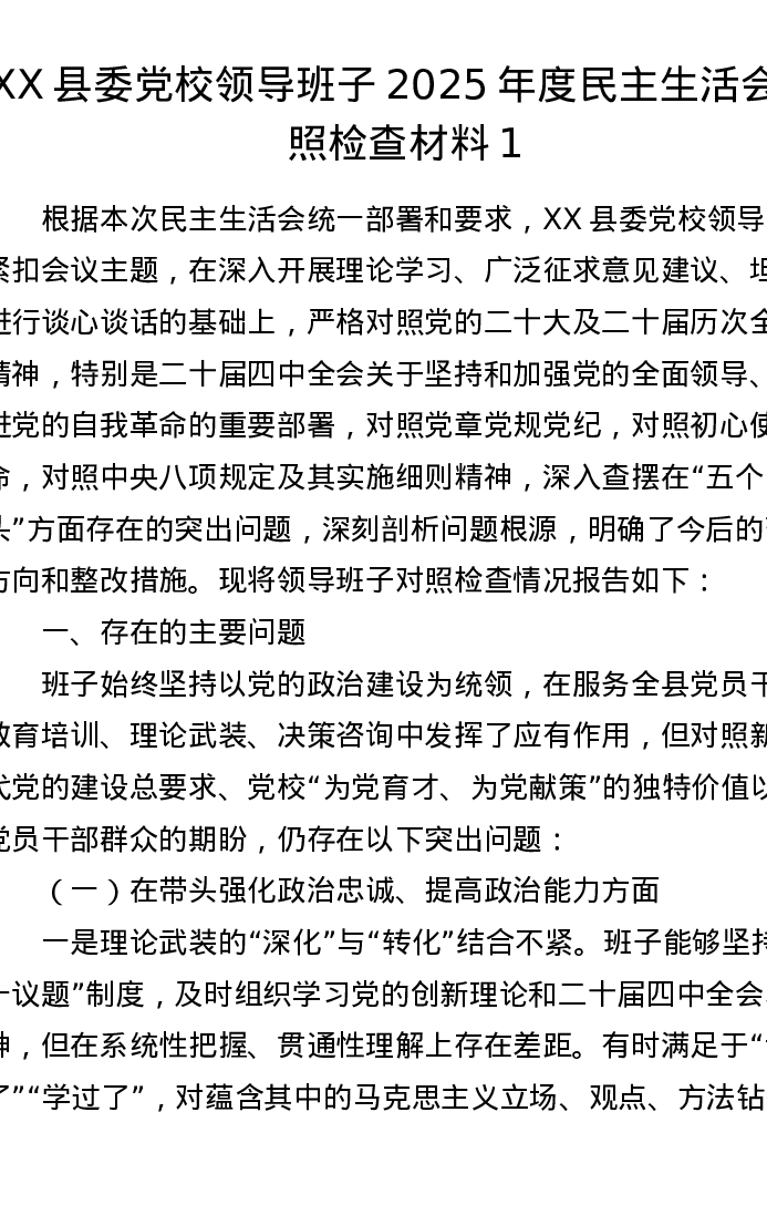 XX县委党校领导班子2025年度xxxxx对照检查材料1(五个带头)