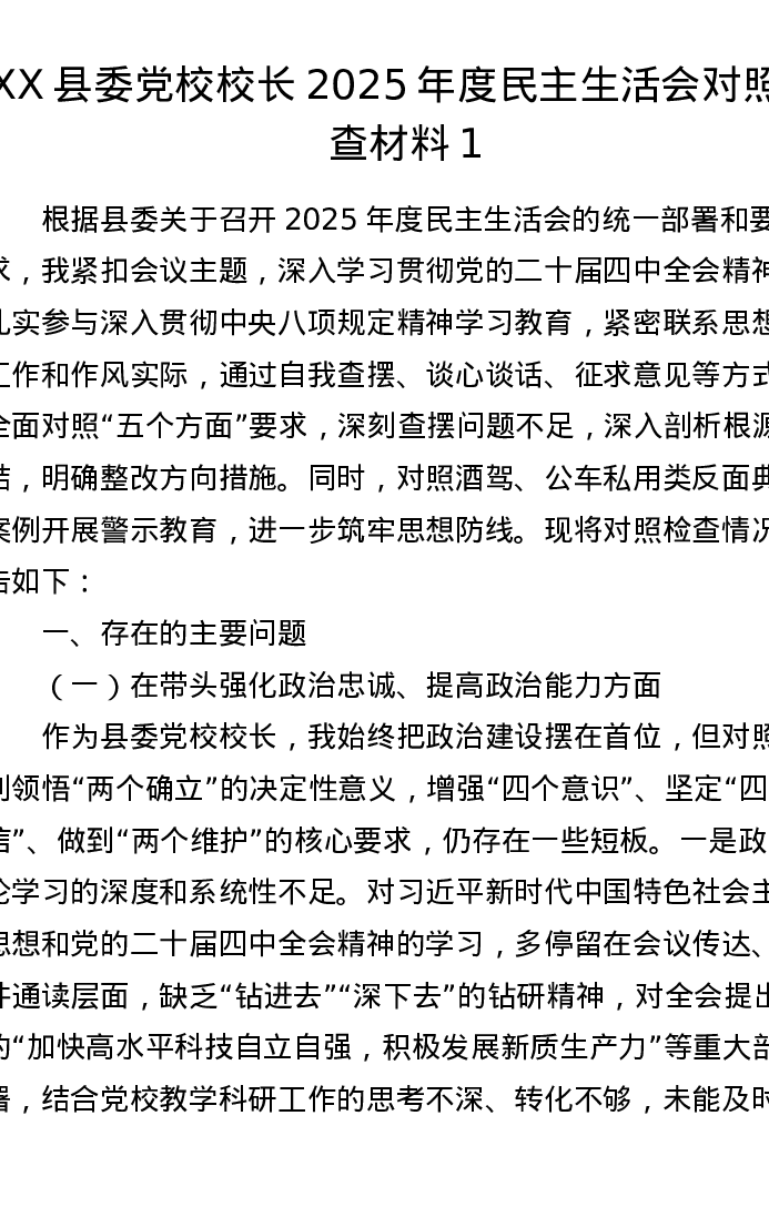 XX县委党校校长2025年度xxxxx对照检查材料1(五个带头)