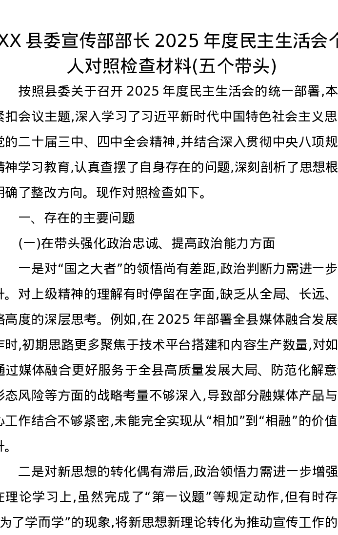 XX县委宣传部部长2025年度xxxxx个人对照检查材料(五个带头)