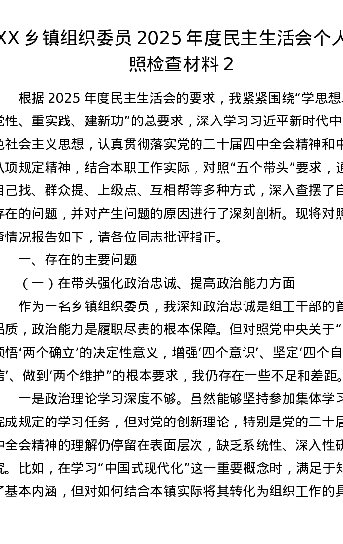 XX乡镇组织委员2025年度xxxxx个人对照检查材料2(五个带头)